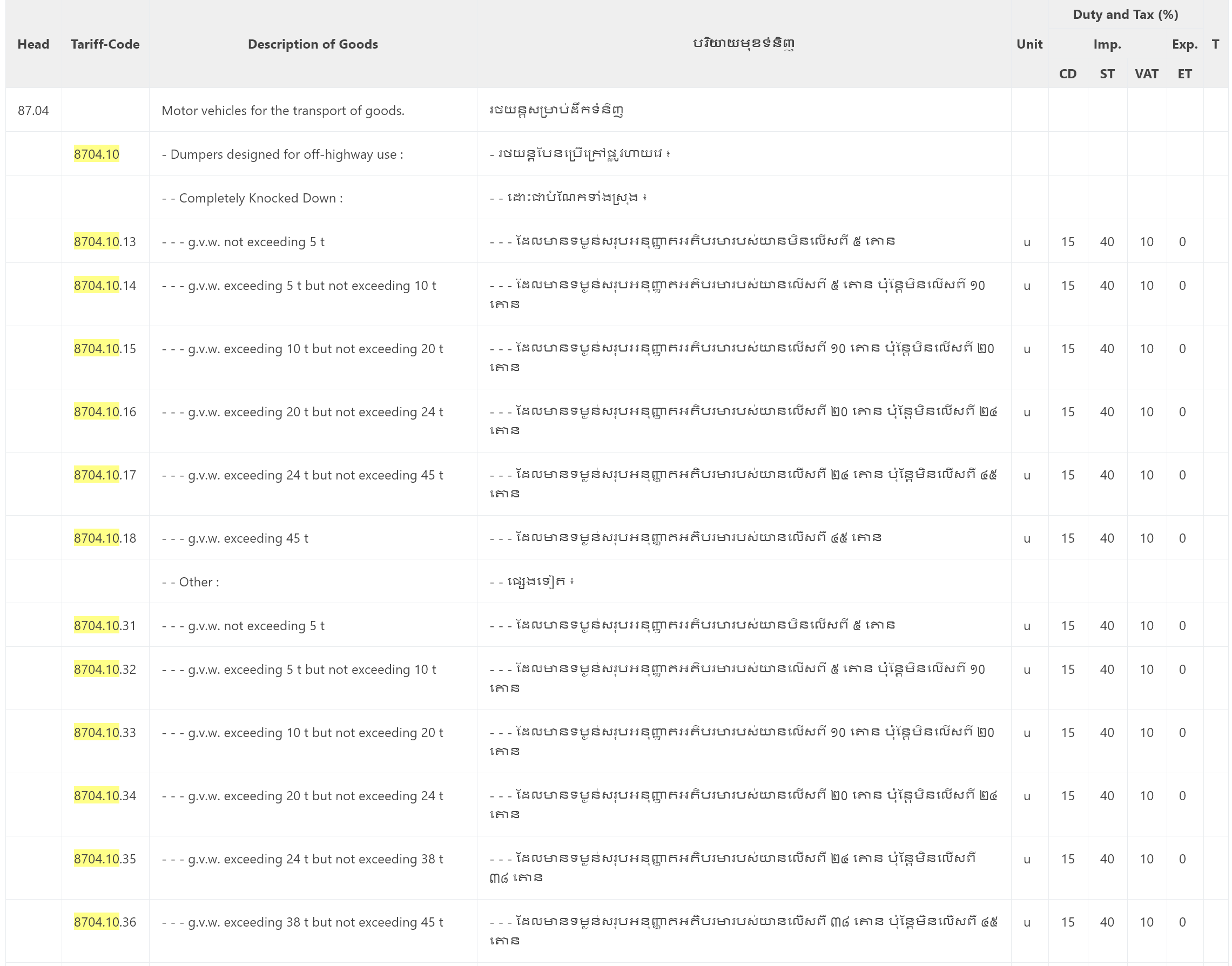 柬埔寨的矿山发展迅速。大量国内企业在柬埔寨投资开设矿山。大量相关设备进口到柬埔寨。 自卸海关编码及关税 ,海关编码为8704,税率为77.10%。