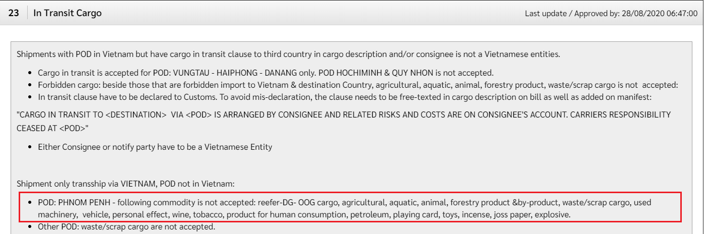 作为一个内陆港口。大部分都是通过越南中转。从越南中转是有很多限制的。具体如附件所示。一定要在发货前了解好目的港及中转货物的限制